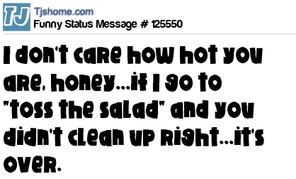 X I don't care how hot you are, honey...if I go to "toss the salad" and you didn't clean up right...it's over.