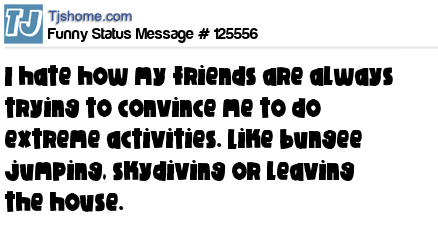 X says I hate how my friends are always trying to convince me to do extreme activities. Like bungee jumping, skydiving or leaving the house.