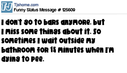 X says I don't go to bars anymore, but I miss some things about it. So sometimes I wait outside my bathroom for 15 minutes when I'm dying to pee.
