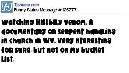 X Watching Hillbily Venom. A documentary on serpent handling in church in WV. Very nteresting for sure, but not on my bucket list.
