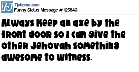 X says Always keep an axe by the front door so I can give the other Jehovah something awesome to witness.