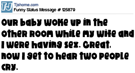X says Our baby woke up in the other room while my wife and I were having sex. Great, now I get to hear two people cry.