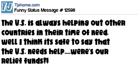 X The U.S. is always helping out other countries in their time of need, well I think its safe to say that the U.S. needs help....were's our relief funds?!
