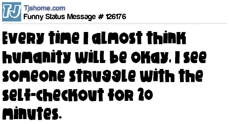 - # 64596 Just when I start to think mankind will be okay, I see someone struggle with the self-checkout for 15 minutes.