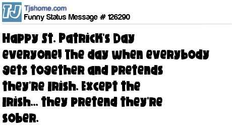 - # 202288 Happy St Patrick's Day, the day when everybody gets together and pretends they're Irish. Except for the Irish -- they pretend they're sober.