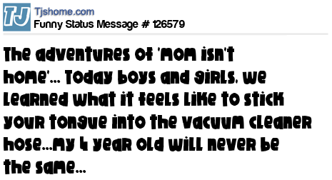 X says The adventures of 'mom isn't home'... Today boys and girls, we learned what it feels like to stick your tongue into the vacuum cleaner hose...my 4 year old will never be the same...
