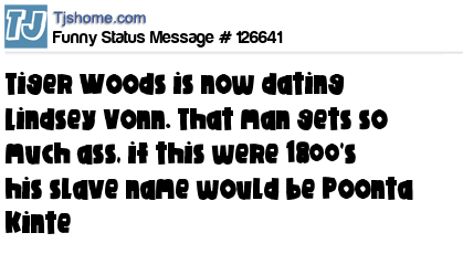 X is Tiger Woods is now dating Lindsey Vonn. That man gets so much ass, if this were 1800's his slave name would be Poonta Kinte