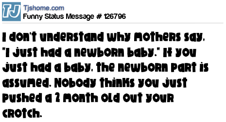 X says I don't understand why mothers say, "I just had a newborn baby." If you just had a baby, the newborn part is assumed. Nobody thinks you just pushed a 2 month old out your crotch.