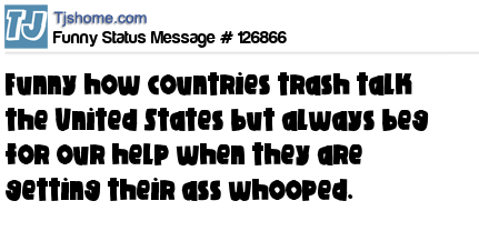 Greedy and over-confident? We get criticized when we don't step in and help a country in crisis, like how we refused to help Syria in their civil war. On the other hand, we are still criticized if we do step in to help. I don't know why we even spend our money to help you ungrateful ba$tards! We believe in freedom, and we will kick all your asses with the quickness! Then when your stupidity will probably still cause you to continue to talk trash, then we'll just be forced to go redneck style on your a$$. We kick a$$ and fight for fun around here, all you do is talk. Talk is cheap but we'll make sure you pay the ultimate price for it! We believe people should have their own freedom of choice. If you don't like it you'd do best to shut your c[at]cksuckers, before the only freedom you have is to use them!