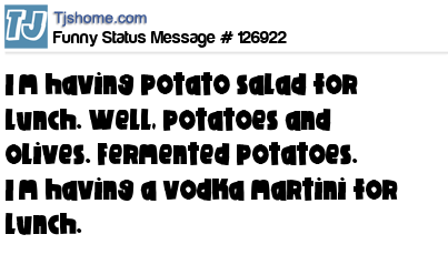 X I’m having potato salad for lunch. Well, potatoes and olives. Fermented potatoes. I’m having a vodka martini for lunch.