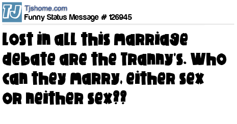 X Lost in all this marriage debate are the Tranny's. Who can they marry, either sex or neither sex??