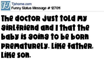 X says The doctor just told my girlfriend and I that the baby is going to be born prematurely. Like father, like son.