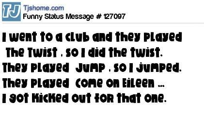 - # 145043 Went to the club. They played The Twist. I twisted. They played Jump. I jumped. They played Come On Eileen. I got arrested.