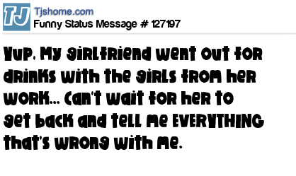 - # 100129 My girlfriend went out for drinks with the girls from her work... Can't wait for her to get back and tell me EVERYTHING that's wrong with me.