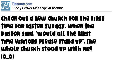 X Check out a new church for the first time for Easter Sunday. When the pastor said, "would all the first time visitors please stand up", The whole church stood up with me! (Ö_Ö)