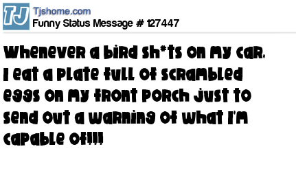 - # 67340 Whenever a bird poops on my car I eat a plate of scrambled eggs on my front porch just to let them know what I'm capable of!