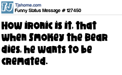 X says How ironic is it, that when Smokey the Bear dies, he wants to be cremated.