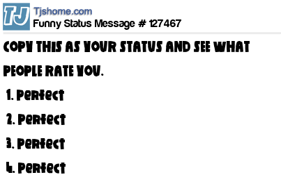 X says COPY THIS AS YOUR STATUS AND SEE WHAT PEOPLE RATE YOU. | 1. Perfect | 2. Perfect | 3. Perfect | 4. Perfect | 5. Perfect | 6. Perfect | 7. Perfect | 8. Perfect | 9. Perfect | 10. Perfect | 11. Perfect | 12. Perfect | 13. Perfect | 14. Perfect | 15. Perfect