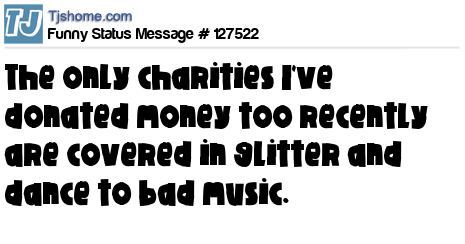 X says The only charities I've donated money too recently are covered in glitter and dance to bad music.