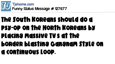 X The South Koreans should do a psy-op on the North Koreans by placing massive TV’s at the border blasting Gangnam Style on a continuous loop.