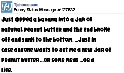 X just dipped a banana into a jar of natural peanut butter and the end broke off and sank to the bottom. ...just in case anyone wants to get me a new jar of peanut butter ...or some meds ...or a life.