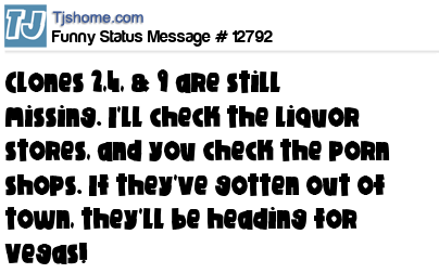 X says clones 2,4, & 9 are still missing. I'll check the liquor stores, and you check the porn shops. If they've gotten out of town, they'll be heading for Vegas!