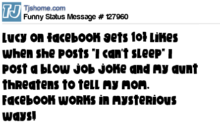 X says Lucy on facebook gets 107 likes when she posts "I can't sleep" I post a blow job joke and my aunt threatens to tell my mom. Facebook works in mysterious ways!