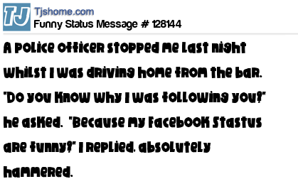 X A police officer stopped me last night whilst I was driving home from the bar. "Do you know why I was following you?" he asked. "Because my Facebook Stastus are funny?" I replied, absolutely hammered.