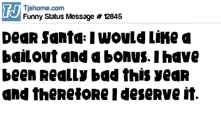 - # 141630 Dear Santa: This year I would like a "Bailout and a Bonus."..."Yes, I know I have been really bad, spent my money frivolously ,even did some illegal things and therefore I think I deserve it."----The Government