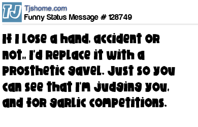 X  If I lose a hand, accident or not,, I'd replace it with a prosthetic gavel. Just so you can see that I'm judging you, and for garlic competitions.