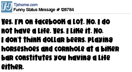 X Yes, I'm on facebook a lot. No, I do not have a life. Yes, I like it. No, I don't think dollar beers, playing horseshoes and cornhole at a biker bar constitutes you having a life either.