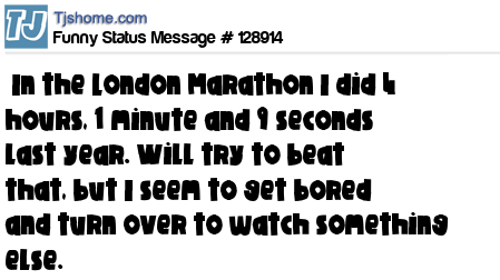 X In the London Marathon I did 4 hours, 1 minute and 9 seconds last year. Will try to beat that, but I seem to get bored and turn over to watch something else.