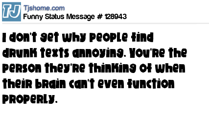 - # 145752 i don't get why people find drunk texts annoying, you're the person they're thinking of when their brain can't even function properly