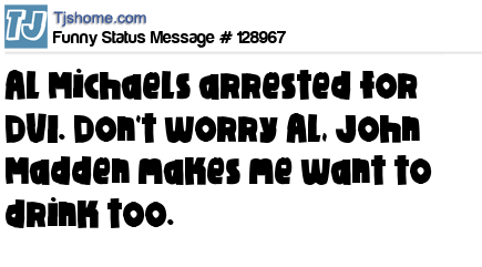 X says Al Michaels arrested for DUI. Don't worry Al, John Madden makes me want to drink too.