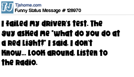 - # 104381 Well I failed my drivers test today. The instructor asked me what I do at Redlights, and I said, "Text and Facebook"