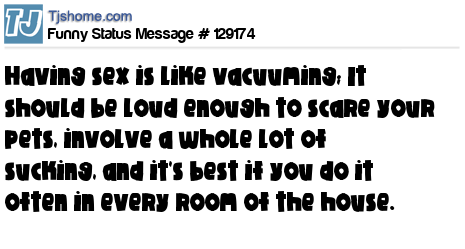 X Having sex is like vacuuming; It should be loud enough to scare your pets, involve a whole lot of sucking, and it's best if you do it often in every room of the house.