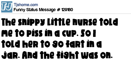 X The snippy little nurse told me to piss in a cup. So I told her to go fart in a jar. And the fight was on.