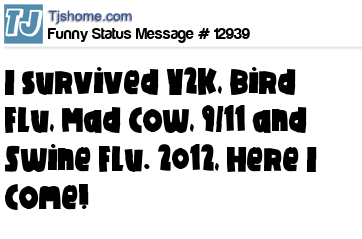 - # 21937 I SURVIVED Y2K, BIRD FLUE, SWINE FLU AND MAD COW DISEASE. 2012 BRING IT ON.