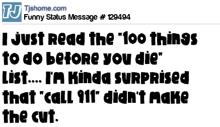 X I just read the "100 things to do before you die" list.... I'm kinda surprised that "call 911" didn't make the cut.