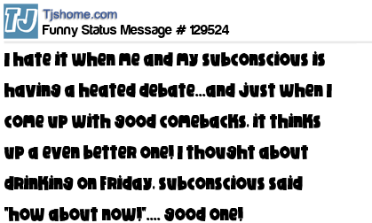 X I hate it when me and my subconscious is having a heated debate...and just when I come up with good comebacks, it thinks up a even better one! I thought about drinking on Friday, subconscious said "how about now!".... good one!