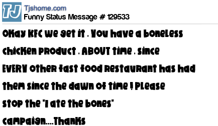 X Okay KFC we get it , You have a boneless chicken product , ABOUT time , since EVERY other fast food restaurant has had them since the dawn of time ! Please stop the "I ate the bones" campaign....Thanks