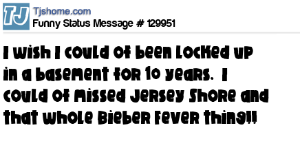 X is I wish I could of been locked up in a basement for 10 years. I could of missed Jersey Shore and that whole Bieber Fever thing!!