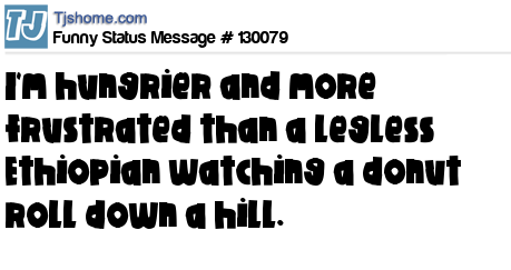 X I'm hungrier and more frustrated than a legless Ethiopian watching a donut roll down a hill.