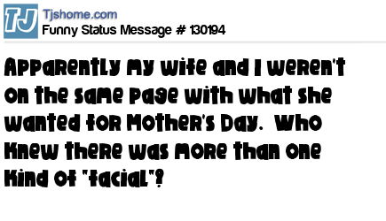 X says apparently my wife and I weren't on the same page with what she wanted for Mother's Day. Who knew there was more than one kind of "facial"?