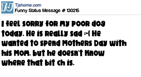 - # 130213 I feel sorry for my poor dog today. He is really sad. He wanted to spend Mothers Day with his Mom, but he doesn't know where that bitch is.