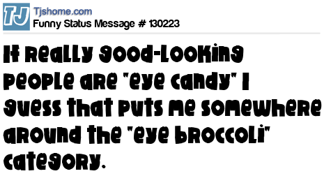 X says If really good-looking people are "eye candy" I guess that puts me somewhere around the "eye broccoli" category.
