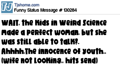 X WAIT, the kids in Weird Science made a perfect woman, but she was still able to talk?. Ahhhh,The innocence of youth.. (wife not looking,, hits send)