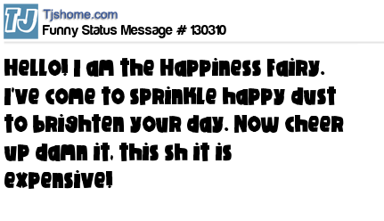 X Hello! I am the Happiness Fairy. I've come to sprinkle happy dust to brighten your day. Now cheer up damn it, this sh it is expensive!