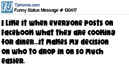 X says I like it when everyone posts on Facebook what they are cooking for diner...it makes my decision on who to drop in on so much easier.