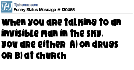 X When you are talking to an invisible man in the sky, you are either A) on drugs Or B) at church